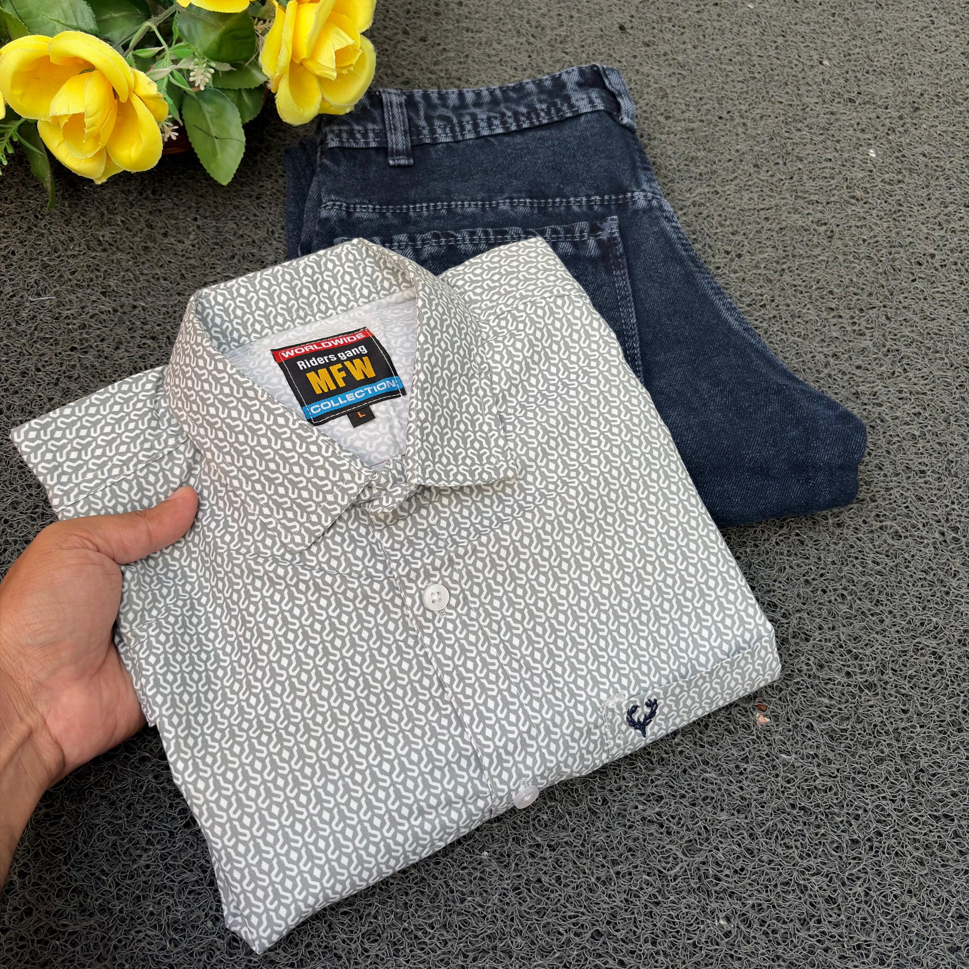 MFW Printed Shirts & Mom Fit Jeans random colours Combo – ₹449 Only("Pick your shirt color, pant’s a surprise!")